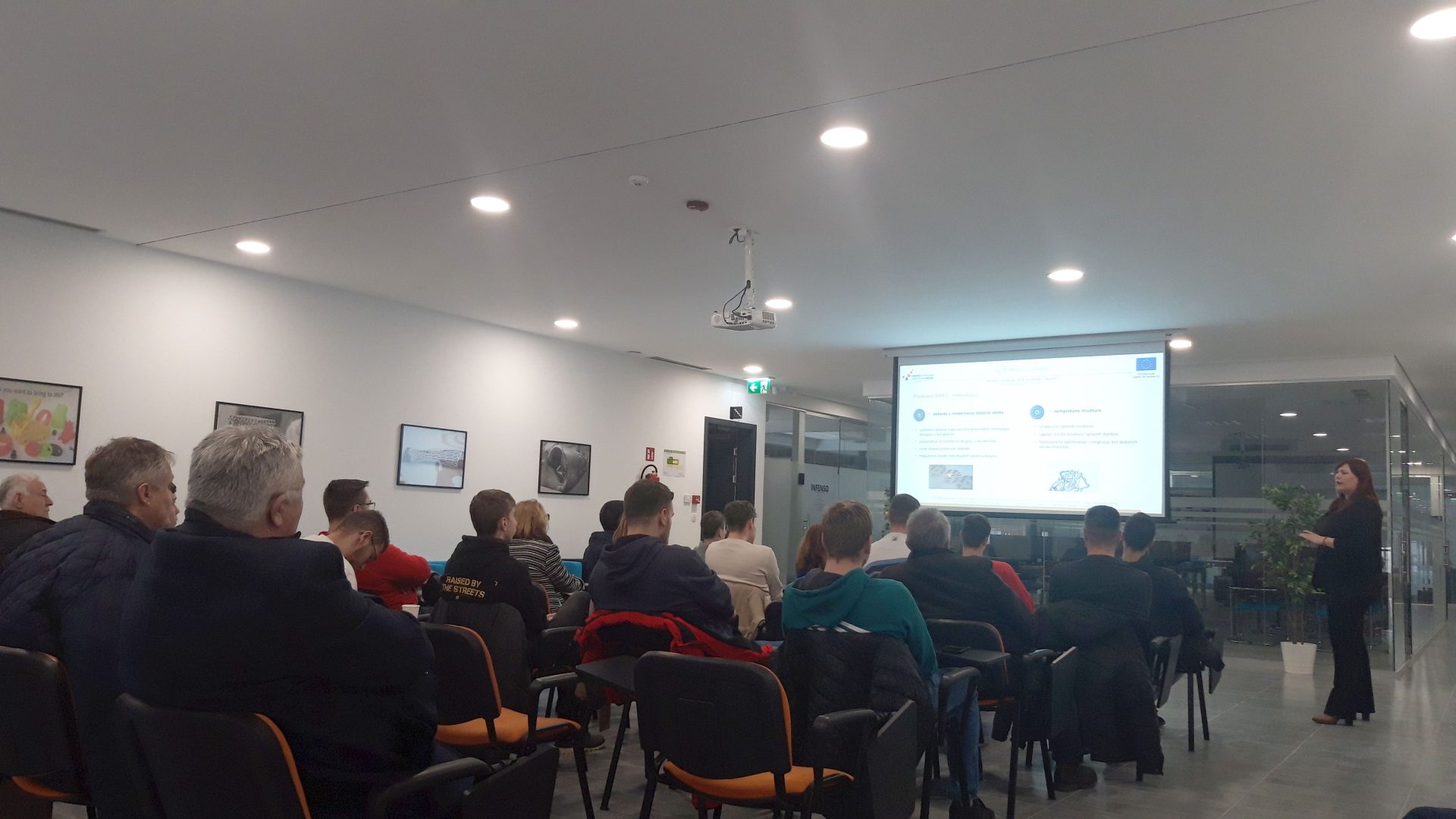 Dr. sc. Ivana Mihalic Pokopec, voditeljica Odjela za tehnologiju prezentirala je sustav za direktnu digitalnu proizvodnju iz metala aditivnom tehnologijom – EOS M 290, raspoloživ u Metalskoj jezgri. Dani sustav koristi DMLS (Direct Metal Laser Sintering) tehnologiju. Njegov radni volumen (ŠxDxV) je: 250 mm x 250 mm x 325 mm. 3D ispis metalnih dijelova obavlja se izravno iz računalnog modela, a osnovni materijal u procesu je prah metalne legure. Princip rada DMLS tehnologije temelji se na tri koraka: nanosač raspoređuje metalni prah po radnoj ploči, laser u svakom sloju tali metalni prah prema zadanom obliku i komad koji se ispisuje raste sloj po sloj. Prednosti takve tehnologije su što su njome omogućene sloboda u modeliranju željenih oblika (savršeno je rješenje kada klasične proizvodne tehnologije dosegnu svoje granice) i izrada vrlo složenih struktura. Zatim, DMLS tehnologija rezultira visokom produktivnošću (izrada prototipa u ranoj fazi razvoja, brži razvoj proizvoda, brži izlazak na tržište) i individualnim rješenjima. Dana tehnologija primjenjuje se u zrakoplovnoj industriji, elektronici, medicini, pri izradi turbina i turbo strojeva, u alatničarstvu, automobilskoj industriji itd. U sklopu prezentacije prikazani su i razni primjeri iz prakse ostvareni u Metalskoj jezgri. Više o 3D pisaču EOS M 290 može se pronaći na: https://www.eos.info/en/additive-manufacturing/3d-printing-metal/eos-metal-systems/eos-m-290.