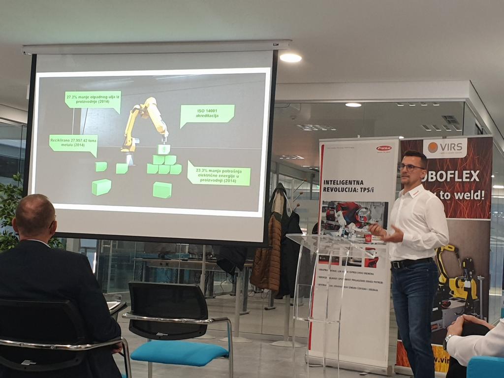Gosp. Vladimir Magdalenić, inženjer prodaje društva Virs d.o.o. ukratko je predstavio tvrtku te istaknuo kako je tvrtka 2019.g. dobila nagradu „Zlatna gazela“ za najbrže rastuću tvrtku u Sloveniji.  Tvrtka je osnovana 2002.g. i zapošljava 42 djelatnika a osnovni program tvrtke je ponuda profesionalne industrijske opreme za zavarivanje i rezanje, uključujući automatizaciju procesa i robotiku po čemu su postali prepoznatljivi i cijenjeni sistemski partner u Sloveniji i šire. Uz to nude i sistemska rješenja za industrijske aplikacije, cjelovito rješenje problema od projektiranja, izrade, puštanja u rad do servisa, edukacije i savjetovanja. Posebno ističu prednost laserskog zavarivanja koje povećava produktivnost za čak 520%.