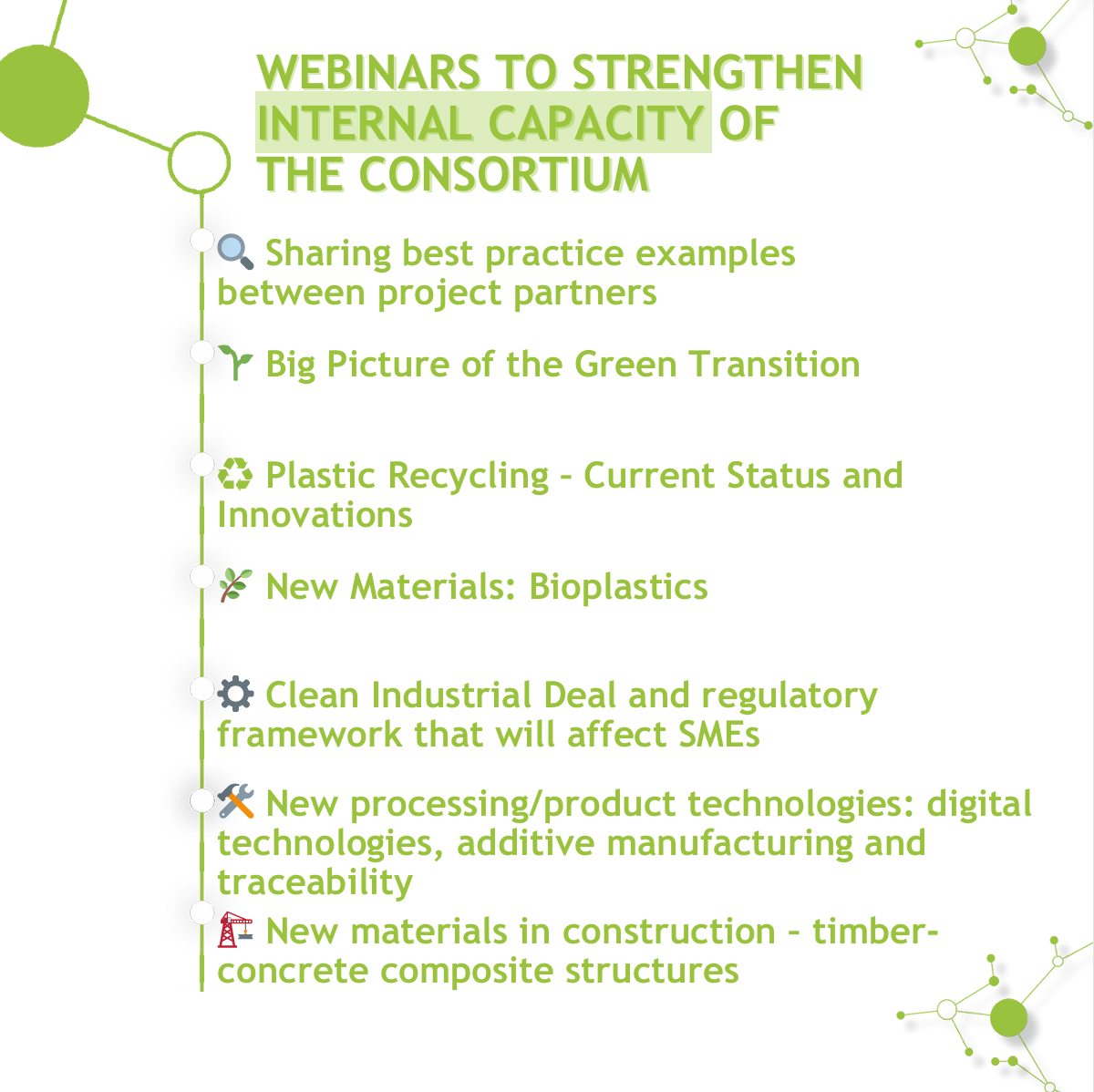 Za izgradnju ove vizije, partnerstvo je sudjelovalo u nizu webinara za jačanje interne stručnosti i razumijevanja. Webinari su uključivali razmjenu dobrih praksi među projektnim partnerima, istraživanje šire slike zelene tranzicije te uvid u inovacije u recikliranju plastike i bioplastici. Također su obuhvatili regulatorne okvire poput Clean Industrial Deal-a i nove tehnologije kao što su digitalizacija, aditivna proizvodnja i transparentnost u razvoju proizvoda. Održivost u građevinarstvu bila je još jedna važna tema, s detaljnim uvidom u drveno-betonske kompozitne konstrukcije. ⚙️